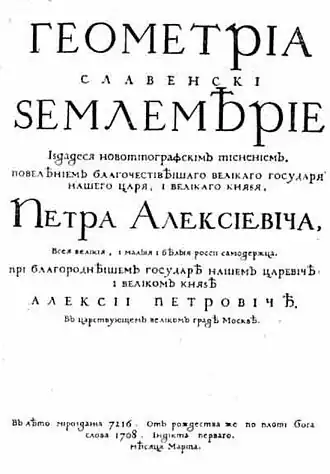 Геометрия славенски землемерие. Первая книга, изданная после реформы Петра I 1708 года. Прописная и строчная литеры I ещё не имеют надстрочных знаков