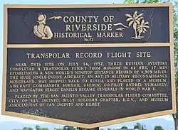 В Сан-Джасинто, США, установлен памятный знак[11] — стела с памятной доской из бронзы, посвящённой беспосадочному полёту АНТ‑25 «рекордная дальность» из Евразии в Северную Америку через Северный полюс протяжённостью 10078 км, который совершил экипаж в составе Михаила Громова, Сергея Данилина и Андрея Юмашева. На доске — изображение самолёта и карта перелёта из Москвы в Сант-Джасинто. Стела установлена по инициативе американской общественности на средства, собранные по подписке путём добровольных пожертвований.