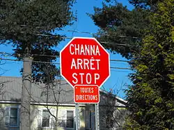 Знак STOP на языках абенаки, французском и английском (сверху вниз)