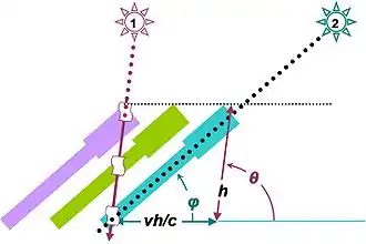 Угол называется углом аберрации[1]. В случае, если относительная скорость систем отсчёта v мала, то угол аберрации равен: