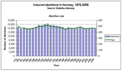 Уровень абортов оставался исторически низким в течение нескольких лет, но начал расти в 2022 году. В 2023 году в Норвегии произведено 12 814 абортов, что на 6,7 % больше, чем в 2022 году. Коэффициент абортов на 1000 женщин репродуктивного возраста (15–49 лет) вырос с 9,9 на 1000 женщин в 2022 году до 10,4 в 2023 году. Коэффициент абортов среди подростков (15—19 лет) на 1000 женщин вырос с исторического минимума в 4,4 в 2020 году до 5,9 в 2023 году[2].