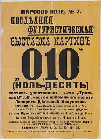 В декабре 1915 года в Петрограде открылась выставка «0,10» (НОЛЬ-ДЕСЯТЬ). На этой выставке была выставлена картина Казимира Малевича «Чёрный квадрат».