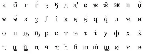 | Cs | Ҵ | Dz | Ӡ | Gj | Ӷь | Kv | Ку | P | Ԥ | Sj | Шь | U | Ы | Jz | Ж |