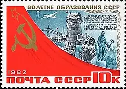 60 лет СССР: • Днепрогэс и домна «Комсомольская» • Скульптура В. Мухиной «Рабочий и колхозница» 10 ноября 1982 г. марка (Mi #5227) была выпущена тиражом 1 200 000 экз. с надпечаткой «Всесоюзная филателистическая выставка» |