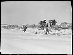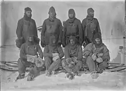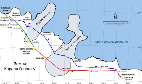 6. Дальняя восточная партия — Моусон, Ниннис и Мерц. Состояла из самых опытных лыжников и каюров экспедиции, должна была пройти к дальнему побережью через материковые льды[63].