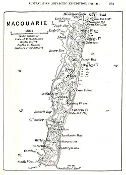 Перед отправлением команду приветствовал губернатор Тасмании Гарри Баррон, были получены телеграммы от короля Георга V и королевы-матери Александры, молебны были проведены в кафедральных соборах Сиднея и Хобарта. В 16:00 по местному времени 4 декабря 1911 года «Аврора» отплыла в Антарктику[30]. Вечером того же дня начался сильный шторм, опасный для перегруженного судна, волнами разбило командирский мостик и моторный катер, погода улучшилась только 8 декабря. Вечером 11 декабря участники экспедиции прибыли на остров Маккуори, высадка в бухте Каролины произошла на следующий день; здесь была проведена серия магнитных наблюдений. Далее «Аврора» перешла в Северо-Восточную бухту, где было обнаружено разбившееся промысловое судно «Клайд». Его команду и груз тюленьего жира было решено отправить назад на вспомогательном судне «Тороа». Моусон с Эйнсвортом и Ханнамом занялись поиском места для береговой базы и радиостанции. К полудню 13 декабря на берег были заброшены необходимые грузы, вечером того же дня вернулась «Тороа»[31]. Работы по обустройству тянулись до 23 декабря, команда трудилась по 16 часов в сутки[32].