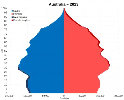 Столица — Канберра. Население на 30 июня 2023 года оценивалось в 26 638 544 человека, большинство из которых проживает в городах на восточном побережье[4]. Основным языком является австралийский английский; ограниченно используются также местные языки австралийских аборигенов.