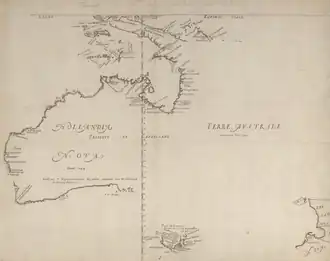 В 1642 году голландец Абел Тасман совершил путешествие, в ходе которого открыл Землю Ван-Димена (позже названную Тасманией) и Новую Зеландию, чем совершил значительный вклад в исследование Австралии. Он проплыл мимо восточного побережья Австралии к южному побережью Новой Гвинеи в 1644 году, когда совершал своё второе путешествие. Он пропустил Торресов пролив между Новой Гвинеей и Австралией и продолжил плыть на запад вдоль австралийского побережья, и в конечном итоге, благодаря ему, на картах было отображено западное побережье Австралии[90][91].
