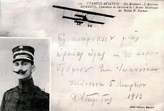 - ↑ Nedialkov, Dimitar. The genesis of air power. — Pensoft, 2004. — ISBN 9789546422118.. — «Greek aviation saw action in Epirus until the capture of Jannina on 21 February 1913. On that day, Lt Adamidis landed his Maurice Farman on the Town Hall square, to the adulation of an enthusiastic crowd.».