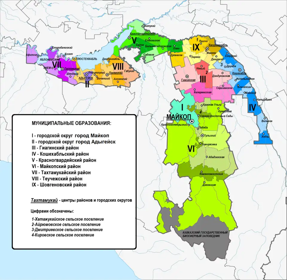 Теучежский город Теучежск Ассоколайский, Вочепшийский, Джиджихабльский, Понежукайский, Пчегатлукайский, Теучежский