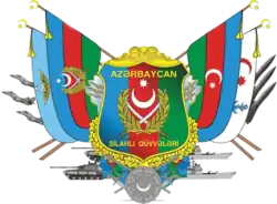 В центре герба изображён огонь, который символизирует «Страну Огней». Цвета, использованные на гербе, являются цветами национального флага Азербайджана. Восьмиконечная звезда символизирует 8 ветвей тюркского народа. Снизу расположен венок из колосьев пшеницы и ветвей дуба. Венок из колосьев символизирует богатство, плодородие. Ветви дуба символизируют древность страны.