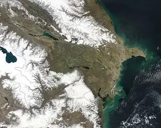 Около половины территории Азербайджана занято горами. На севере — хребет Кавказа, в средней части — Кура-Аракская низменность, на юго-востоке — Талышские горы и Ленкоранская низменность, на западе — Армянское нагорье[48].