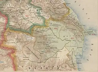 В январе 1804 года к России после месячной осады Гянджи было присоединено Гянджинское ханство. Трактаты, заключённые в 1805 году между главнокомандующим русских войск в Грузии как официальным представителем России и соответствующими ханами, юридически закрепили вхождение в состав России Карабахского, Шекинского и Ширванского ханств. В 1806 году к России были присоединены Бакинское и Кубинско-Дербентское ханства, а в 1809 году — Талышское ханство[22]. После победы России в русско-иранской войне (1804—1813) 13 октября 1813 года в селении Гюлистан был подписан мирный договор между Россией и Ираном. Гюлистанский договор был основан на принципе status quo ad presentem, то есть он закреплял за сторонами те границы, которые установились к моменту подписания договора[23].