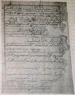 Страница из «Татарской хрестоматии Адербейджанского наречия» (1852). Сост. Вазех и И. Григорьев.