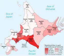 В России небольшие группы айнов и их ассимилированных другими народностями потомков проживают в Хабаровском крае, на Сахалине, и, самое многочисленное сообщество[48], — в Камчатском крае (село Запорожье Усть-Большерецкого района).