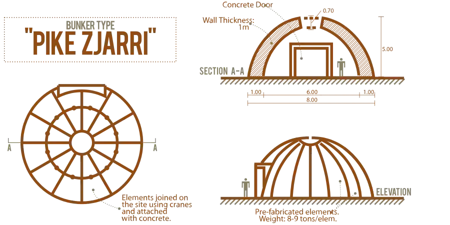 Строительство сети бункеров в прибрежной зоне, на стратегических горных проходах и у автомобильных трасс, в ряде населённых пунктов и на границе с Югославией и Грецией началось с 1967 года и продолжалось до самой смерти Энвера Ходжа в 1985 году. За этот период было построено в общей сложности 173 371 бетонных бункеров различной конструкции (как правило, типовой).[16] В первую очередь эти приготовления были нацелены против ЮНА, не имевшей (в большом количестве) достаточно мощных вооружений для разрушения этих укреплений.[17]