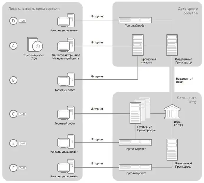 Варианты C, D, E и F относятся к группе вариантов прямого доступа к рынкам и характеризуются подключением торгового робота непосредственно к звену биржевой торговой инфраструктуры, в данном случае к промежуточному серверу (промсерверу) FORTS. В связи с минимальным количеством звеньев, DMA является оптимальным решением для алгоритмических систем высокочастотной торговли.