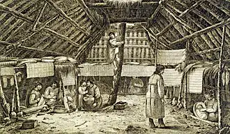 Полуземлянка вмещала от 10 до 40 семей[22]. Внутри вдоль стен сооружали нары. Каждая семья жила на своей части нар, отделенных друг от друга столбами и занавесками. Под нарами хранили утварь. Летом переселялись в отдельные лёгкие постройки. В XIX веке традиционная полуземлянка видоизменилась: стены и крышу, сделанные из жердей и досок, обкладывали дёрном. Наверху находился люк для освещения, сбоку — выход через небольшие сени. Освещали жилища жировыми лампами, иногда клали печи. Наряду с традиционной утварью пользовались привозной посудой фабричного производства.