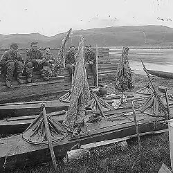 Алеутские мужчины охотились с байдар на морских животных, а на суше добывали морских котиков и — зимой — тюленей; в некоторых районах они вели охоту на медведей и карибу[54]. Калана добывали в открытом море при помощи гарпуна (метательного копья на длинной веревке), сивучей и моржей — на лежбищах, нерпу заманивали на берег манком — надутой нерпичьей шкурой, имитируя крик самки, на китов охотились с помощью копья, кончик которого смазывали ядом аконитом. Через 2-3 дня море выбрасывало на берег тушу животного. Гарпуны и копья бросали с помощью копьеметалок — деревянных дощечек длиной 50-70 см с продольным желобком, углублениями для пальцев на одном конце и костяным упором на другом.