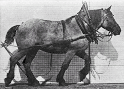 Галоп состоит из ряда скачков, он бывает с правой и с левой ноги. При галопе с правой ноги лошадь сначала ступает левой задней ногой, потом двумя ногами по диагонали (правой задней ногой и левой передней), потом правой передней и наступает фаза подвисания — лошадь летит над дорогой.