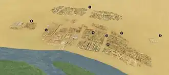 В южной части Ахетатона располагались дома придворных, квартал скульпторов. В мастерской начальника скульпторов Тутмоса были найдены скульптуры Эхнатона и Нефертити. Севернее находились жилища чиновников и торговцев. По берегам Нила стояли амбары, в гористой части был царский некрополь. Рабочие некрополя жили в квартале с узкими улицами и тесными домами, окружёнными высокой стеной с одними воротами.