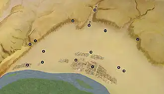 Эти скальные гробницы расположены с севера и востока от города и разделены на две группы вади. Неподалёку установлена пограничная стела V[14][16]: