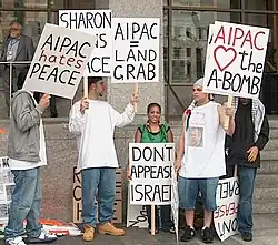 Протест в ходе конференции АЙПАК в мае 2005 года, Вашингтон. Надписи на плакатах: «АЙПАК ненавидит мир», «АЙПАК любит ядерную бомбу», «Не потакайте Израилю».