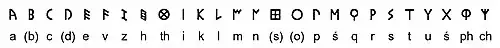- a b c d v e z h θ i k l m n ξ o p ś q r s̀ t u ṡ φ χ s̀auruas̀zuaz