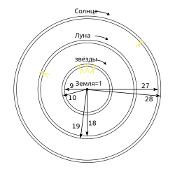 Таким образом, Анаксимандр полагал, что все небесные светила находятся на разном расстоянии от Земли. Видимо, порядок следования соответствует следующему физическому принципу: чем ближе оно к небесному огню и, следовательно, чем дальше от Земли, тем оно ярче. Анаксимандр сделал попытку определить численные параметры системы мира. До нас дошли только некоторые из них. Согласно различным древним авторам, размеры кольца Солнца составляют в 27 или 28 больше размера земного цилиндра, кольцо Луны в 19 раз превышает Землю. Ряд историков предпринял попытки реконструировать параметры системы Анаксимандра. Некоторые из них сведены в следующую таблицу (наклонная линия (например, 9/10) указывает внешние и внутренние значения). Предполагается, что в основе Вселенной Анаксимандра лежит математический принцип: все расстояния кратны трём.