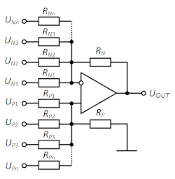 Подключая входные сигналы к инвертирующему и неинвертирующему входам операционного усилителя, можно получить схему, реализующую одновременно сложение и вычитание аналоговых сигналов. Эта схема, называемая параллельным сумматором, изображена на рисунке 2. Принцип действия схемы аналогичен принципу действия простейшего сумматора.