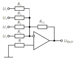 Таким образом, схема рисунке 1 выполняет над входными напряжениями операцию суммирования с отрицательными весовыми коэффициентами: