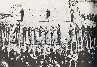 Фотография расстрела Максимилиана I. Слева направо: Томас Мехиа, Мигель Мирамон, Максимилиан I