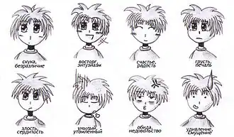 Передача эмоций в аниме является поводом для отдельного разговора. Помимо традиционных для аниме видов проявления чувств персонажем — изменением выражения лица или тона его голоса, используется ряд других приёмов. Эмоции могут изображаться подчёркнуто нереалистично, гипертрофированно — персонажи говорят с закрытыми глазами, чтобы передать безапелляционность, или принимают картинно демонический вид, когда проявляют гнев. В комедийных ситуациях, с целью показать несерьёзность чувства, применяются пиктограммы, такие, как картинка «капельки пота» или «вздувшихся вен», возникающие поверх головы героя, либо в рамочке над ней.