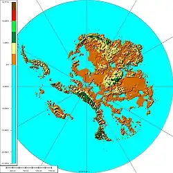 Антарктида — самый высокий континент Земли, средняя высота поверхности континента над уровнем моря составляет более 2000 м, а в центре континента достигает 4000 м. Бо́льшую часть этой высоты составляет постоянный ледниковый покров континента, под которым скрыт континентальный рельеф, и лишь 0,3 % (около 40 000 км²) её площади свободны ото льда — в основном в Западной Антарктиде и Трансантарктических горах: острова, участки побережья, так называемые «сухие долины» и отдельные гребни и горные вершины (нунатаки), возвышающиеся над ледяной поверхностью. Трансантарктические горы, пересекающие почти весь материк, делят Антарктиду на две части — Западную Антарктиду и Восточную Антарктиду, имеющие различное происхождение и геологическое строение. На востоке находится высокое (наибольшее возвышение поверхности льда 4004 м над уровнем моря) покрытое льдом Советское плато[16]. Западная часть состоит из группы гористых островов, соединённых между собой льдом. На тихоокеанском побережье расположены Антарктические Анды, высота которых превышает 4000 м; самая высокая точка континента — 4892 м[17] над уровнем моря — массив Винсон в горах Элсуорт. В Западной Антарктиде находится и глубочайшая депрессия континента — впадина Бентли, вероятно, рифтового происхождения. Глубина впадины Бентли, заполненной льдом, достигает 2555 м ниже уровня моря.