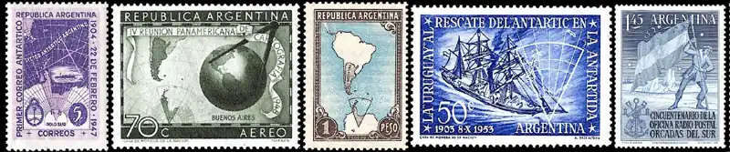 Аргентина рассматривает «свой» сектор Антарктиды как часть провинции Огненная Земля, Антарктида и острова Южной Атлантики[25] . Антарктические территориальные претензии Аргентины начали оформляться с 1903—1904 годов по ходу освоения близлежащих частей Антарктиды, в июле 1939 года они приобрели официальный статус, однако первые почтовые марки, зафиксировавшие этот факт, появились лишь в 1947 году (Sc #561, 562). В феврале 1957 года претензии Аргентины были официально распространены и на Фолклендские (Мальвинские) острова, остров Южная Георгия, Южные Сандвичевы, Южные Оркнейские и Южные Шетландские острова[26].
