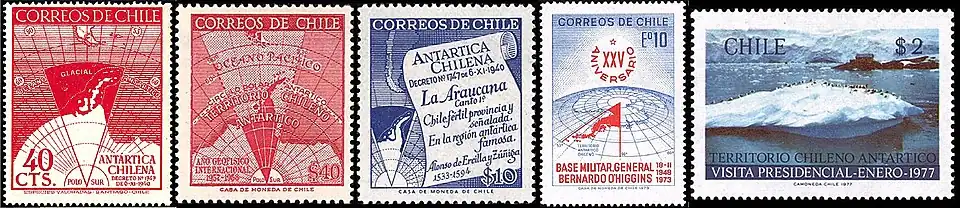 Чили считает «свой» антарктический сектор частью провинции Магальянес (исп. Región de Magallanes y de la Antártica Chilena), что было впервые зафиксировано специальным декретом Министерства внутренних дел республики в ноябре 1940 года[27]. Однако первые посвящённые этому почтовые марки увидели свет лишь в 1947 году (Sc #247, 248). С тех пор Чили публикует на своих почтовых марках карту антарктического сектора регулярно, но с меньшей интенсивностью, чем соседняя Аргентина. С 1992 года в некоторых случаях чилийские марки полярной тематики сопровождаются надписью «Antártica Chilena. Chile» ( (Sc #1020) и позже), хотя, как и остальные выпуски, они имеют хождение по всей стране и каталогами почтовых марок в отдельную категорию не выделяются.