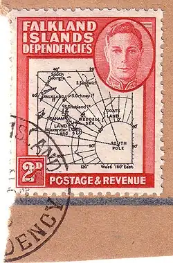 В 1944 году для них была выпущена серия почтовых марок Фолклендов с красными надпечатками, причём для каждой из территорий по отдельности — для Земли Грейама, о́строва Южная Георгия, Южных Оркнейских и Южных Шетландских островов. С 1946 года почтовые выпуски Falkland Islands Dependencies стали общими. В 1962 году из состава колонии была выделена самостоятельная Британская антарктическая территория (БАТ), продолжившая выпуск собственных марок. С 1963 году эмитируются особые почтовые марки и для Южной Георгии, с 1986 года (Sc #101) они несут надпись «Южная Георгия и Южные Сандвичевы Острова»[8].