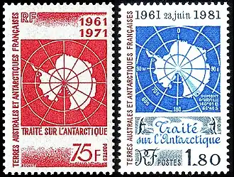 В соответствии с Договором об Антарктике, вступившем в силу с 23 июня 1961 года, все земли южнее 60° ю. ш. не могут принадлежать ни одному государству, демилитаризованы и безъядерны[2]. Однако, несмотря на его подписание и ратификацию, ряд государств трактует экстерриториальность Антарктики лишь как «замораживание» своих территориальных претензий на континент и прилегающее пространство, но не как отказ от них. Соответственно, они выпускают для «своих» территорий специальные знаки почтовой оплаты либо периодически освещают тему своих претензий (например, публикуют географические карты) на обычных почтовых марках[3]. К этим странам относятся: