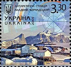 - В 2009 году на почтовой марке Украины из двухмарочной сцепки и малого листа, посвящённых украинской полярной станции «Академик Вернадский», художник Владимир Таран изобразил карту Антарктиды, выделив цветом произвольные секторы континента с центром в точке южного полюса[33]. Один из таких секторов, на который попала надпись Ukraina, пришёлся на тихоокеанскую сторону Антарктиды (за исключением Норвегии, выдвигающей претензии на остров Петра I, на неё пока не претендует ни одна страна мира), однако два других оказались в зонах антарктических притязаний Австралии и Франции.