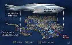 Антарктический щит обладает собственной подледниковой гидросистемой, которая включает в себя почти 400 антарктических подледниковых озёр, значительная часть которых связана посредством подлёдных рек в единую водную систему[6]. Самым большим из них является озеро Восток.
