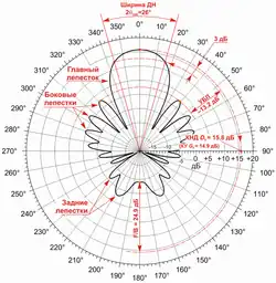 Параметры и пример диаграммы направленности (ДН) антенны: