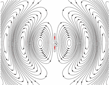 Дипольная антенна, излучающая радиоволны. Условно показаны петли электрического поля