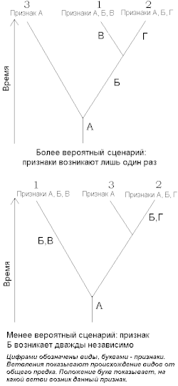 В дальнейшем примитивное состояние признака может быть интерпретировано как плезиоморфия, а продвинутое — как апоморфия. Апоморфия, присущая данным двум группам (или большему их числу) называется синапоморфией; предполагается, что она имелась и у последнего общего предшественника данных групп, но до его появления отсутствовала. Надо заметить, что при выделении клад могут использоваться только синапоморфии[8].