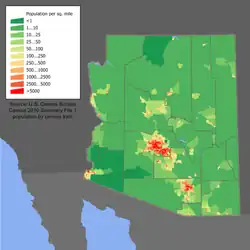 По данным Бюро переписи населения США, на 1 июля 2011 года население Аризоны составляло 6 482 505 человек; по сравнению с показателем переписи 2010 года прирост составил 1,42 %[10]. Население метрополии Финикса выросло с 1991 по 2001 годы на 45,3 %, что сделало Аризону вторым штатом с самым высоким приростом населения в течение 90-х годов (первым была Невада)[11]. Сегодня население метрополии Финикса превышает 4,3 млн человек. Около 58 % населения Аризоны проживают в городах с населением более 100 тыс. человек (самый высокий показатель среди всех штатов страны).