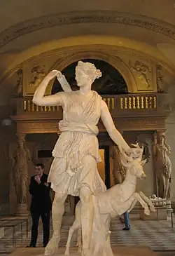 - Изображалась с золотым луком и колчаном за плечами, с копьём в руках, иногда с полумесяцем на голове (символ богини Луны), часто в сопровождении лани и нимф[70][71]. Традиционно богиню, символизировавшую целомудрие, «одевали» в короткий хитон. Позднее, в XVI—XIX веках, стали появляться изображения нагой богини, что в то время приводило к настоящим скандалам (например, Диана-охотница, созданная в 1790 Гудоном).