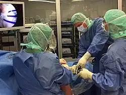Кроме того, требуются артроскопические рабочие инструменты, отличающиеся размером и длиной от открытых хирургических инструментов (например, зонды с шкалой, артроскопические ножницы, артроскопические щипцы, толкатели узлов и многое другое). Чтобы избежать слишком больших потерь водяного давления, порты могут быть дополнительно оборудованы самозакрывающимися канюлями (жесткими или гибкими).