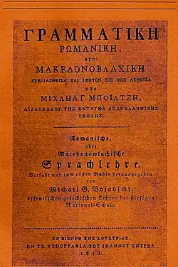 - ↑ Papahagi V. Învăţaţi aromâni din secolul al XVIII-lea // Lumina. — Grebena, 1939. — № 1—4 (1938—1939), anul III. — P. 12—25.