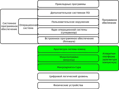 - Микроархитектурный уровень, интерпретация (микропрограммы) или непосредственное выполнение. Электронные схемы исполняют машинно-зависимые программы. Совокупность регистров процессора формирует локальную память. См. также арифметико-логическое устройство, устройство управления. Его задача — интерпретация команд уровня 2 (уровня архитектуры команд). В настоящее время на уровне архитектуры команд обычно находятся простые команды, которые выполняются за один цикл (таковы, в частности, RISCмашины).