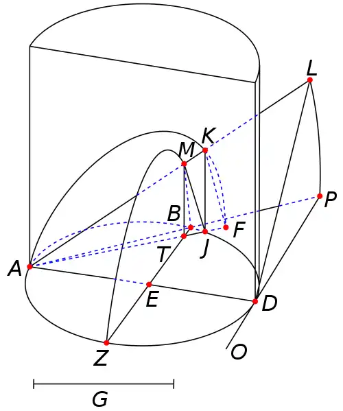 Если теперь будем вращать этот первый вертикальный полукруг от точки к точке оставляя его все время вертикальным, вокруг образующей полуцилиндра, проходящей через точку считая эту точку неподвижной, то полукруг на указанном выше прямом полуцилиндре высечет некоторую кривую линию. При вращении от точки к точке прямая опишет полуконус, а точка опишет полукруг или «второй вертикальный полукруг». Этот полуконус пересечёт полученную кривую в точке которая будет соответствовать точке на круге Хорда пересечёт в точке а «второй вертикальный полукруг» в точке [26].