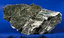 - актинолит-асбест Ca2(Mg, Fe2+)5Si8O22(OH)2.